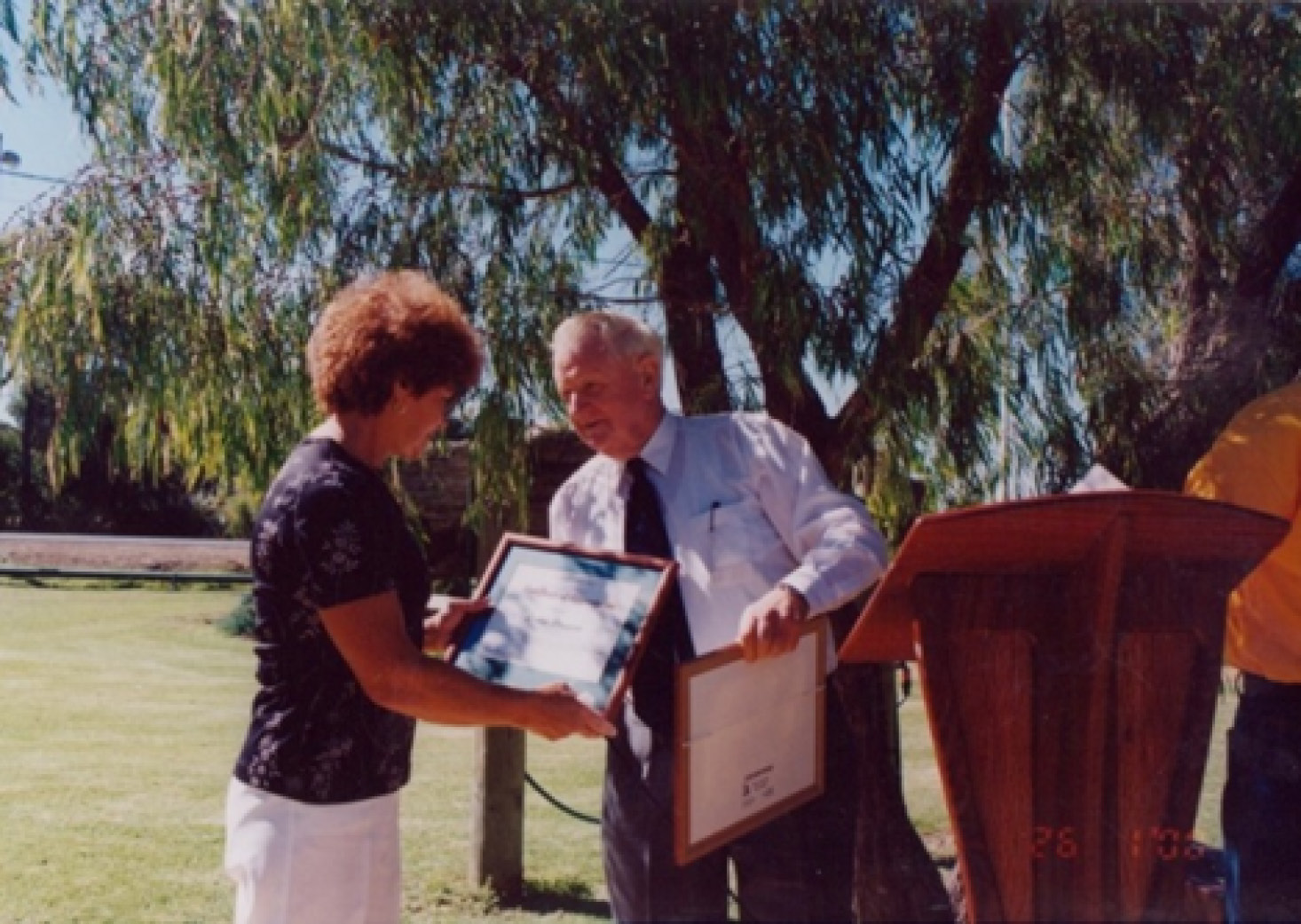 Rod permits the installation of a water tank on their land on Wirring Road to supply the town with water.Rod assists in laying the pipeline that supplies water from the old dam to irrigate the cricket oval and the Cowaramup Primary School.